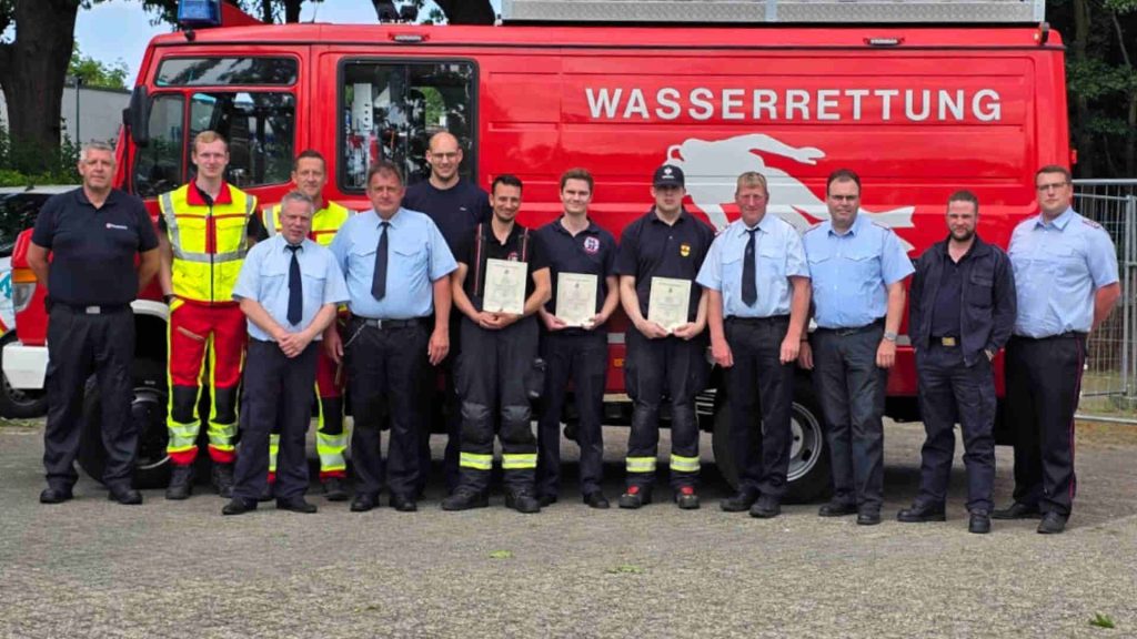 Die praktische Prüfung am Geester Speicherbecken bestanden Pascal Micheel (FF Meppen) und Christopher Kerschbaum (FF Lingen als Doppelmitglied) zum Feuerwehrtaucher der Stufe I. Die Befähigungsurkunde zum Feuerwehrtaucher der Stufe II wurde Hannes Pooth (FF Papenburg) überreicht. Er darf nach bestandener Prüfung nicht nur in Wassertiefen bis 20 Meter tauchen, sondern auch sägen, Seile anschlagen und Hebekissen anbringen. Zusätzlich darf er auch in Gefahrenbereichen, wie zum Beispiel unter Eisdecken oder in Schleusen und anderen Bauwerken tauchen.