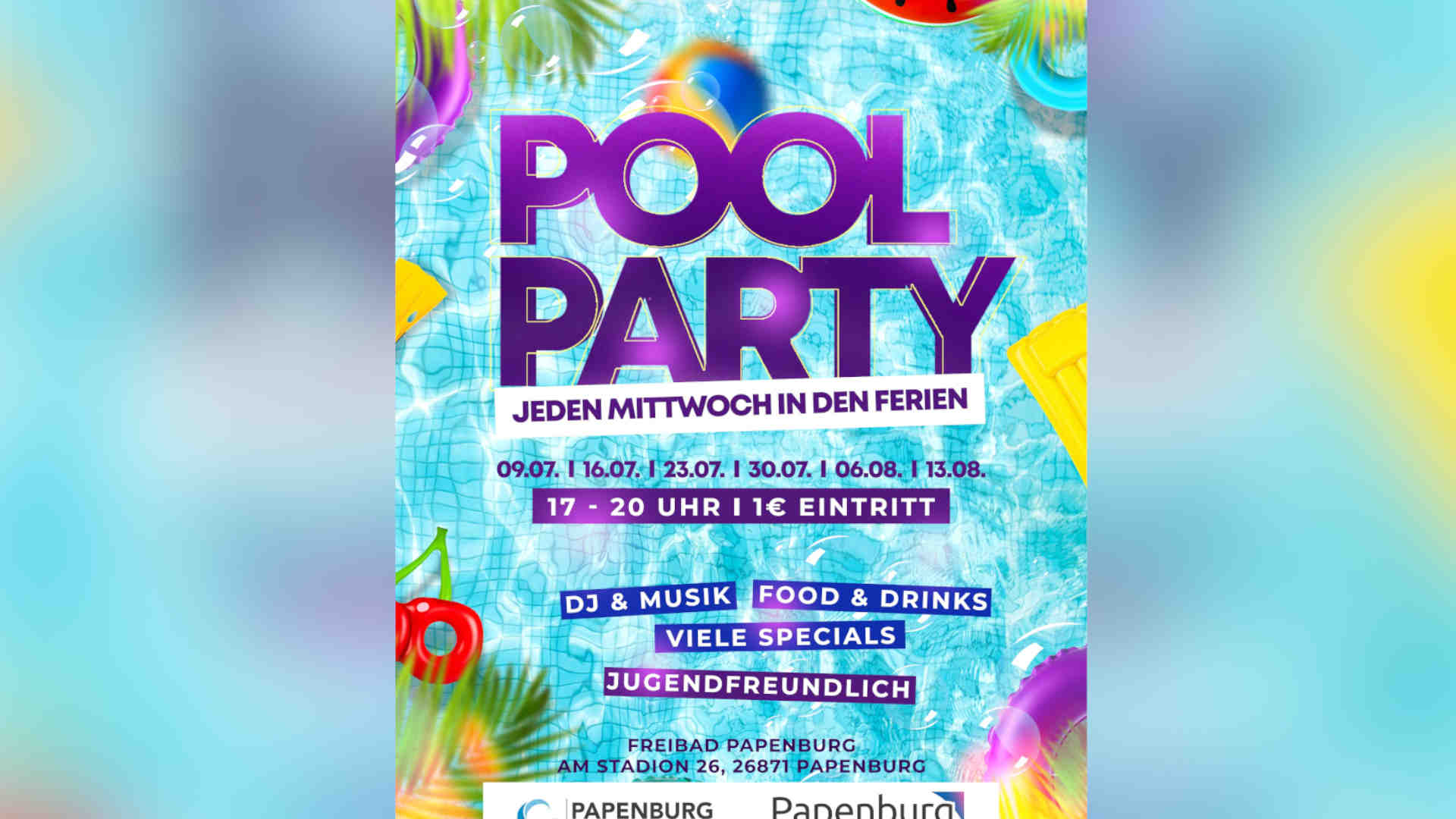 · Jeden Mittwoch in den Sommerferien steigt von 17 bis 20 Uhr die Poolparty im Freibad Papenburg – mit DJ, Musik, Snacks, alkoholfreien Drinks und vielen Specials. Der Eintritt kostet nur 1 Euro. Ein cooles Event speziell für Jugendliche – günstig, sicher und mitten in der Stadt.
