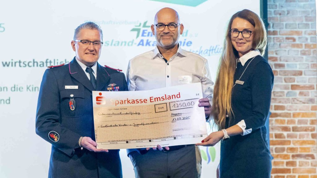 Im Rahmen seiner Mitgliederversammlung übergab der Wirtschaftsverband Emsland 1.250 Euro an die Kinder- und Jugendfeuerwehren im Emsland. Die Summe stammt aus der Online-Impulsreihe „Recht wirtschaftlich“, deren Teilnahmebeiträge und Spenden vollständig an gemeinnützige Projekte weitergeleitet werden.