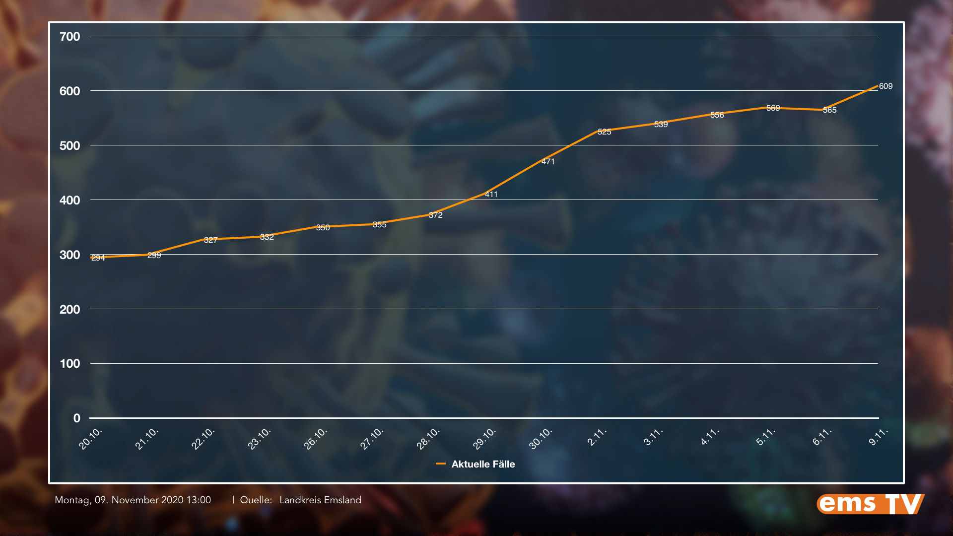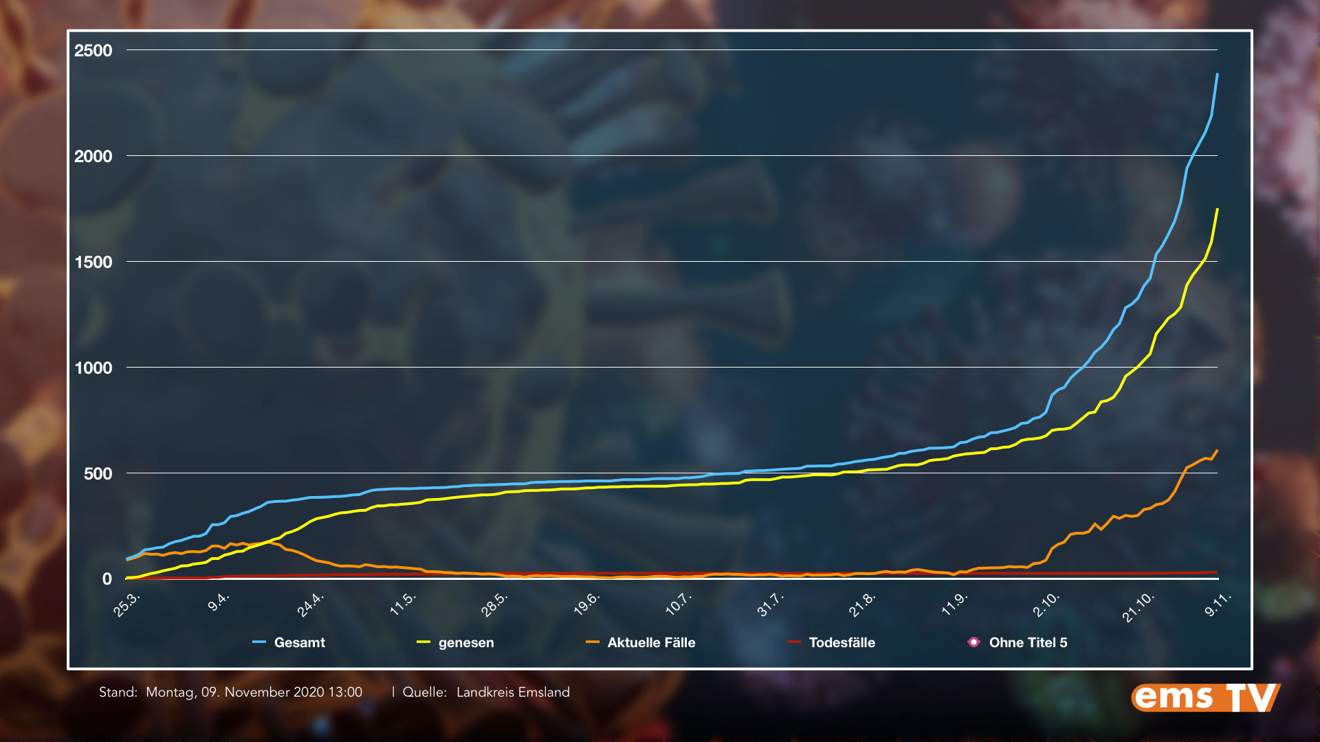 Landkreis Emsland: Das Gesundheitsamt bestätigte seit Beginn der Pandemie 2391 Corona-Infektionen. Dies sind 203 mehr als am vergangenen Freitag. Als Genesenen gelten momentan 1752 Emsländerinnen und Emsländer. Die Zahl aktueller Fälle stieg von Freitag auf Montag, von 565 auf 609 Infektionen. Es verstarben 30 Menschen in Zusammenhang mit COVID-19. Aktuell befinden sich laut Angaben des Landkreis Emsland 1660 Personen in häuslicher Quarantäne. Weitere Informationen finden sie hier: https://www.emsland.de/buerger-behoerde/aktuell/coronavirus/fallzahlen-den-emslaendischen-kommunen.html