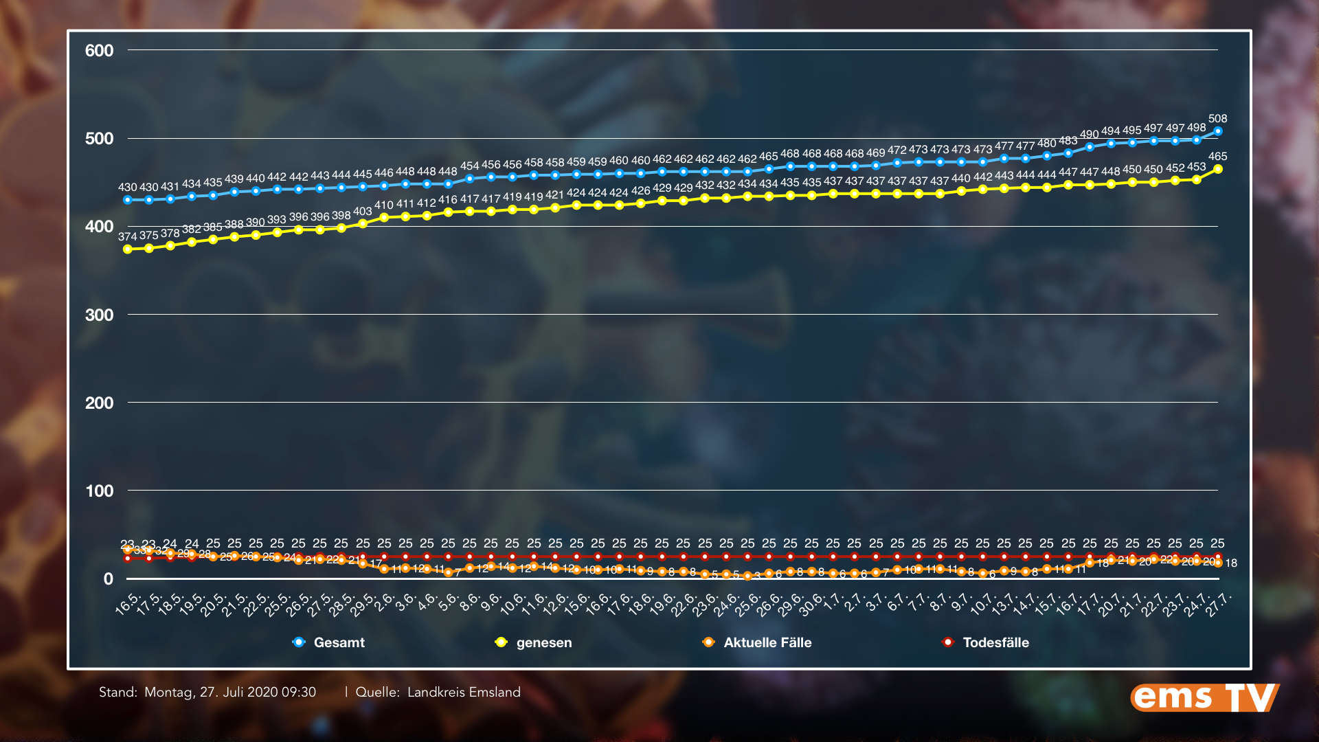 Landkreis Emsland: Landkreisweit wurden (Stand: 27.07.2020) 508 Corona-Fälle bestätigt. Dies sind 10 mehr als am Freitag. Gleichzeitig stieg auch die Zahl der genesenen Personen. Heute zählen 465 Menschen als genesen. Am Freitag lag dieser Wert bei 453.