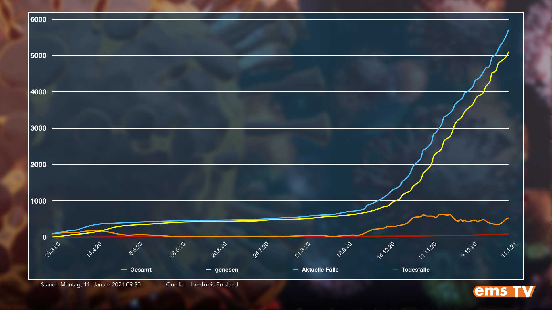 Landkreis Emsland: Seit Beginn der Pandemie vermeldete das Gesundheitsamt insgesamt 5.713 Infektionen mit dem Corona-Virus. Dies sind 155 mehr als am vergangenen Freitag. Die Zahl der Genesenen stieg im selben Zeitraum um 141, auf insgesamt 5.104.