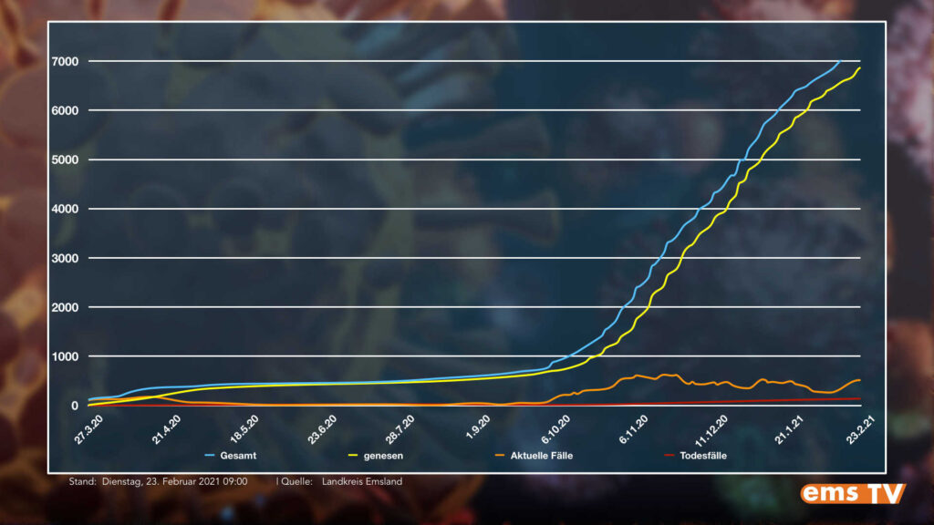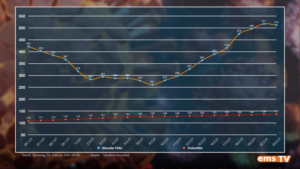 Bislang verstarben 137 Emsländerinnen und Emsländer in Verbindung mit dem Virus, damit kam seit gestern ein weiterer Todesfall hinzu. In häuslicher Quarantäne befinden sich momentan 1180 Personen. Der Wert der 7-Tage-Inzidenz liegt heute, laut den Berechnungen des Landes Niedersachsen, 115,9.