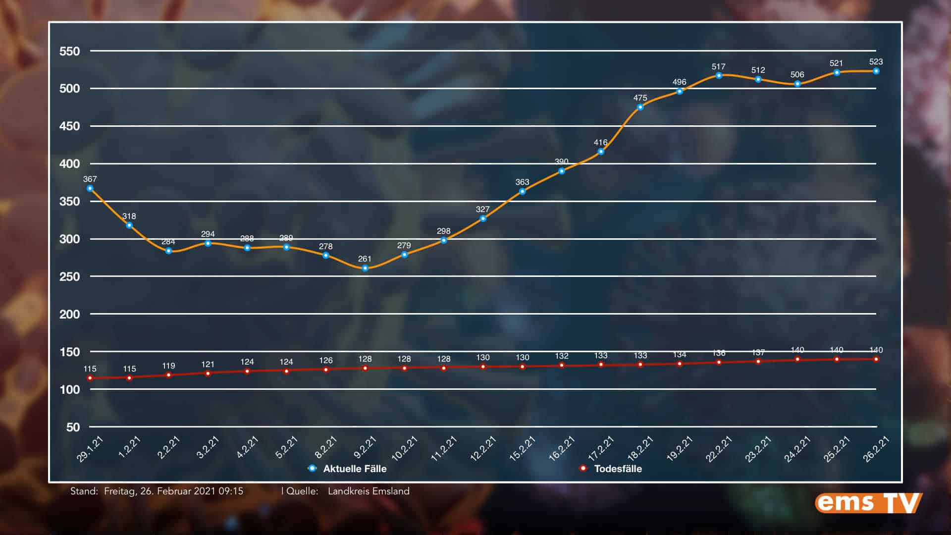 Landkreis Emsland: Seit Beginn der Pandemie meldete das Gesundheitsamt 7.664 Infektionen mit dem Coronavirus. Dies ist ein Anstieg um 57 im Vergleich zu gestern. Die Zahl der Genesenen stieg um 55 und liegt damit bei 7.001. Aktuell gelten 523 Menschen als infiziert.