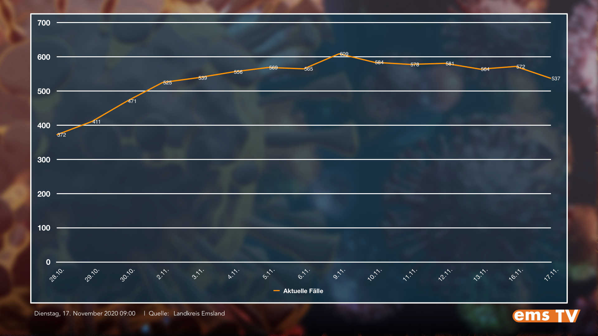 Zudem verzeichnet das Gesundheitsamt des Landkreises heute, wie auch gestern, drei weitere Todesfälle. Somit liegt die Zahl der insgesamt im Zusammenhang mit dem Corona-Virus Verstorbenen bei 39. Als aktuell infiziert gelten 537 Infizierte – 35 weniger als gestern. In häuslicher Quarantäne befinden rund 1880 Menschen.