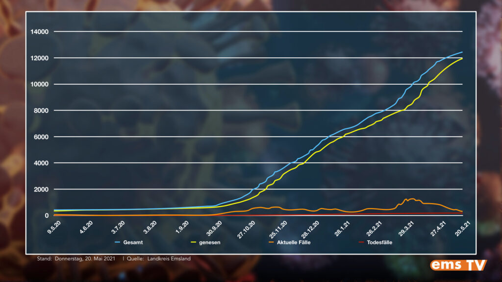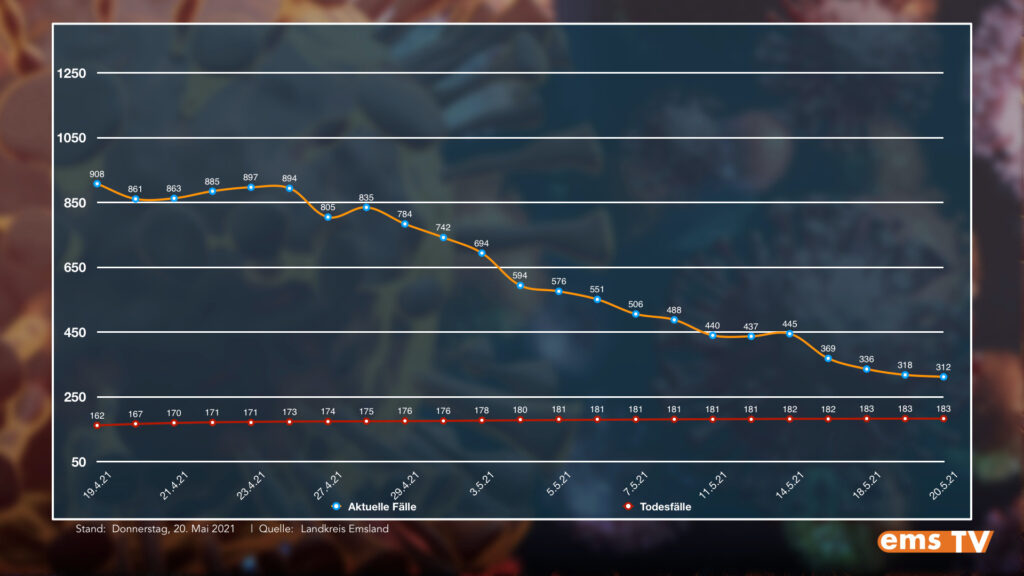 Landkreis Emsland: Das Gesundheitsamt meldet seit gestern 34 weitere bestätigte Neuinfektionen mit dem Coronavirus. Die Zahl der Genesenen stieg im selben Zeitraum um 40, auf insgesamt 11.948. Als aktuell infiziert gelten 312 Personen. Seit Beginn der Pandemie verstarben 183 Emsländerinnen und Emsländer im Zusammenhang mit dem Virus. Momentan befinden sich 499 Personen in Quarantäne.
