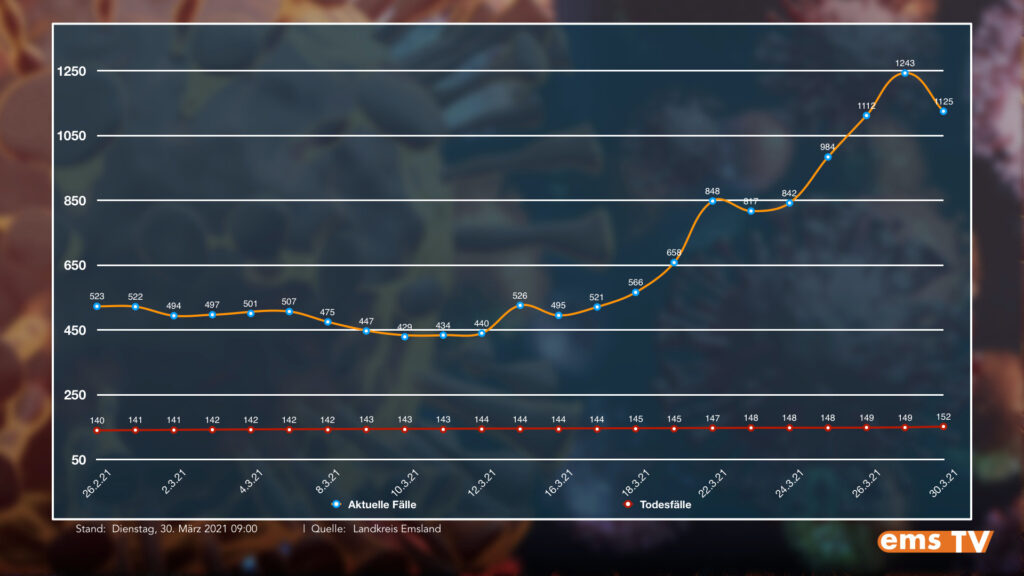 Bisher verstarben 152 Emsländerinnen und Emsländer in Zusammenhang mit COVID-19. Das sind drei Person mehr als gestern. In häuslicher Quarantäne befinden sich 2.522 Menschen.