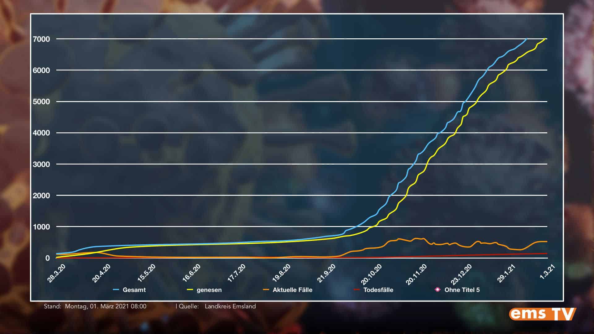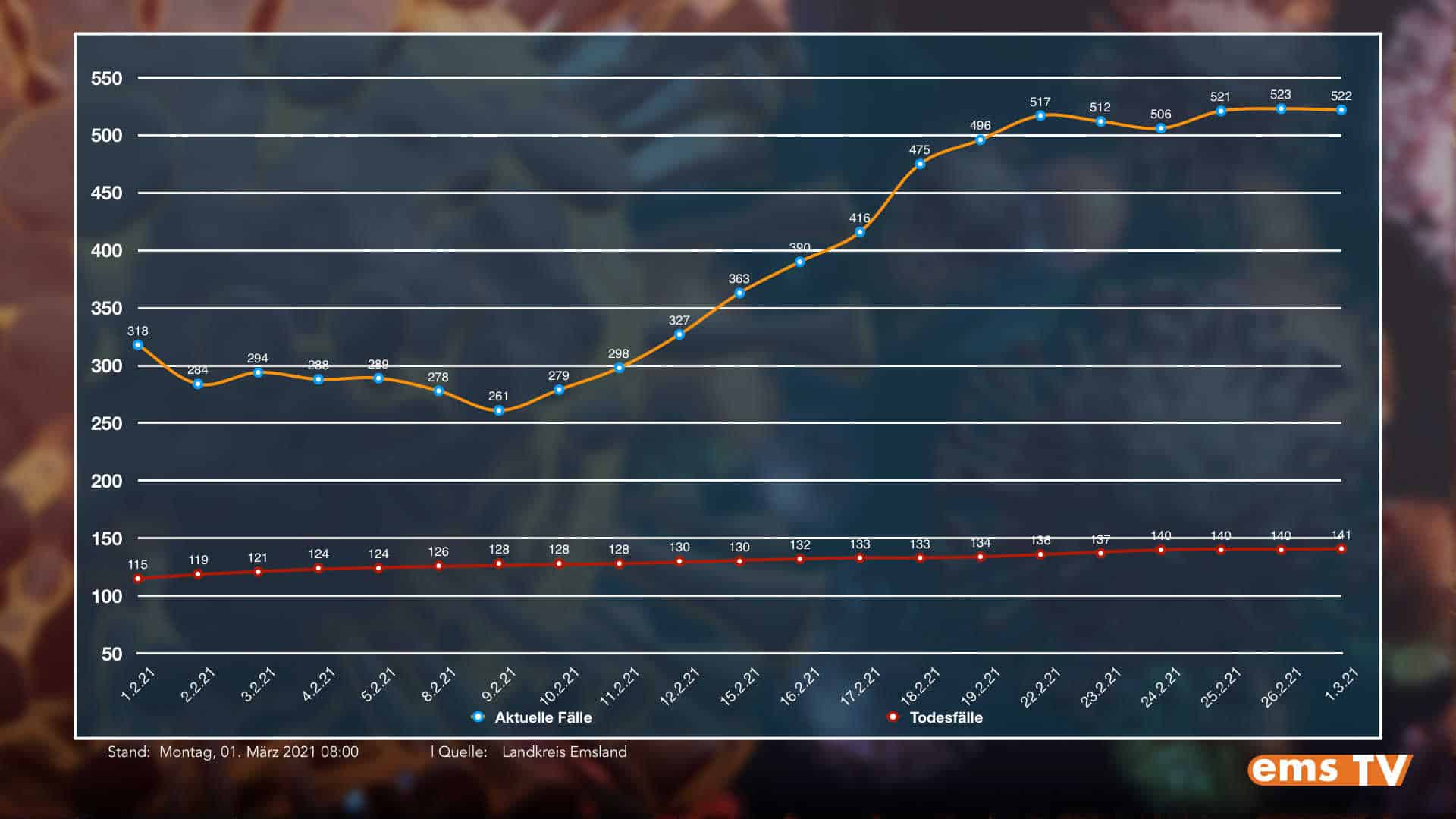 Aktuell werden 522 Infizierte im Landkreis Emsland behandelt. Bislang verstarben 141 Corona-Infizierte im Kreisgebiet. Somit verstarb über das Wochenende eine weitere Person im Zusammenhang mit dem Virus.