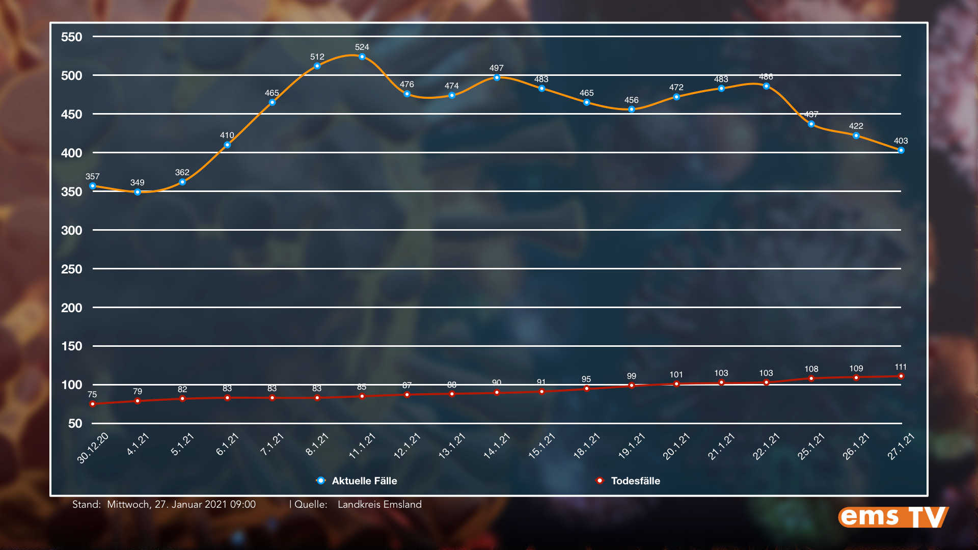 Landkreis Emsland: Seit Beginn der Pandemie meldete das Gesundheitsamt insgesamt 6.438 Infektionen mit dem Corona-Virus. Dies sind 30 mehr als am Vortag. Die Zahl der Genesenen stieg um 47, auf jetzt 5.924. Als aktuell infiziert gelten 403 Menschen. Die Zahl der Todesfälle in Verbindung mit einer COVID-19 Infektion stiegen im Vergleich zu gestern um zwei. Somit verstarben seit Beginn der Pandemie 111 Emsländerinnen und Emsländer in Zusammenhang mit dem Virus. Momentan befinden sich 746 Personen in häuslicher Quarantäne.
