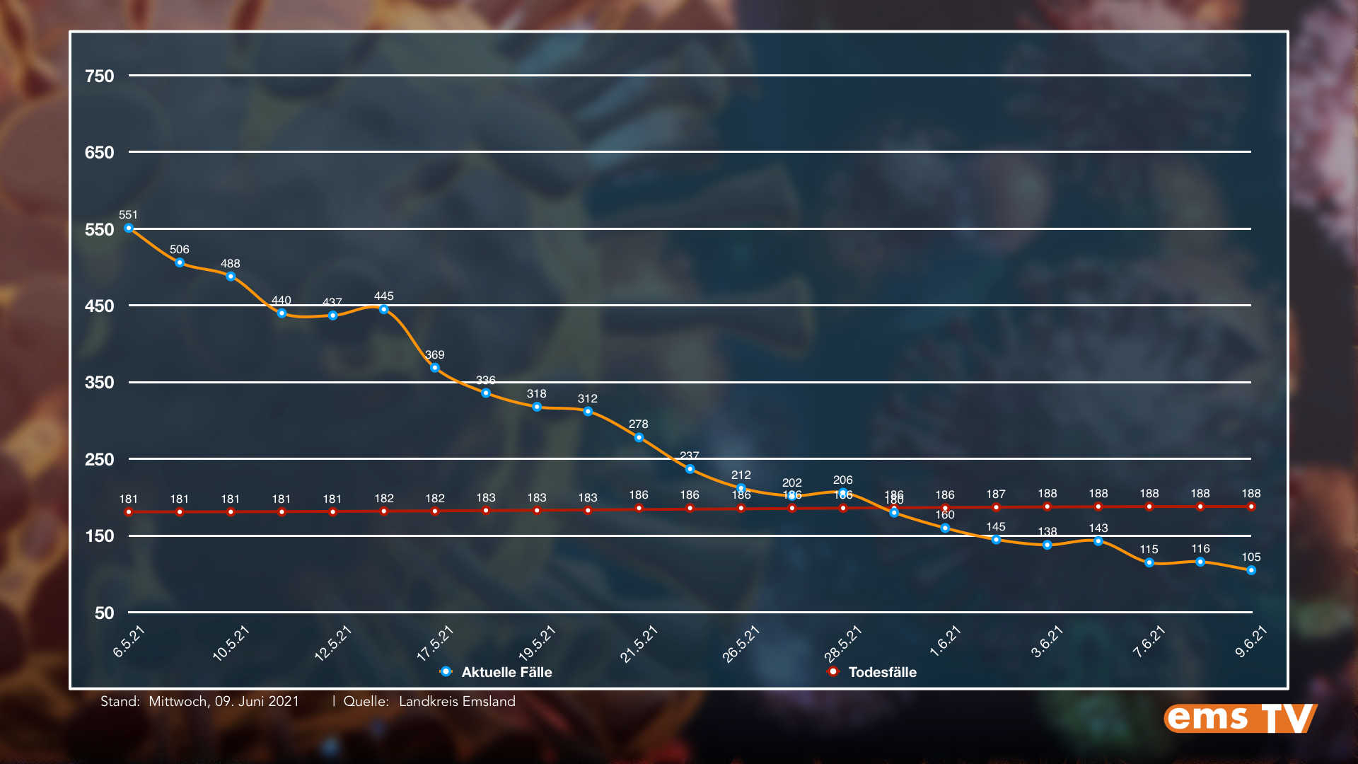 Landkreis Emsland: Der Landkreis Emsland informiert heute wieder über die aktuellen Entwicklungen der Corona-Pandemie in der Region. Demnach sind seit gestern fünf weitere Infektionen des Virus Sars-CoV-2 bestätigt. Damit steigt die Gesamtzahl auf 12.644 nachgewiesene Infektionen. Davon erholen konnten sich bislang 12.351 Emsländerinnen und Emsländer – damit steigt die Zahl, im Vergleich zum Vortag, um 16. Aktuell sind 105 Menschen im Landkreis Emsland infiziert.