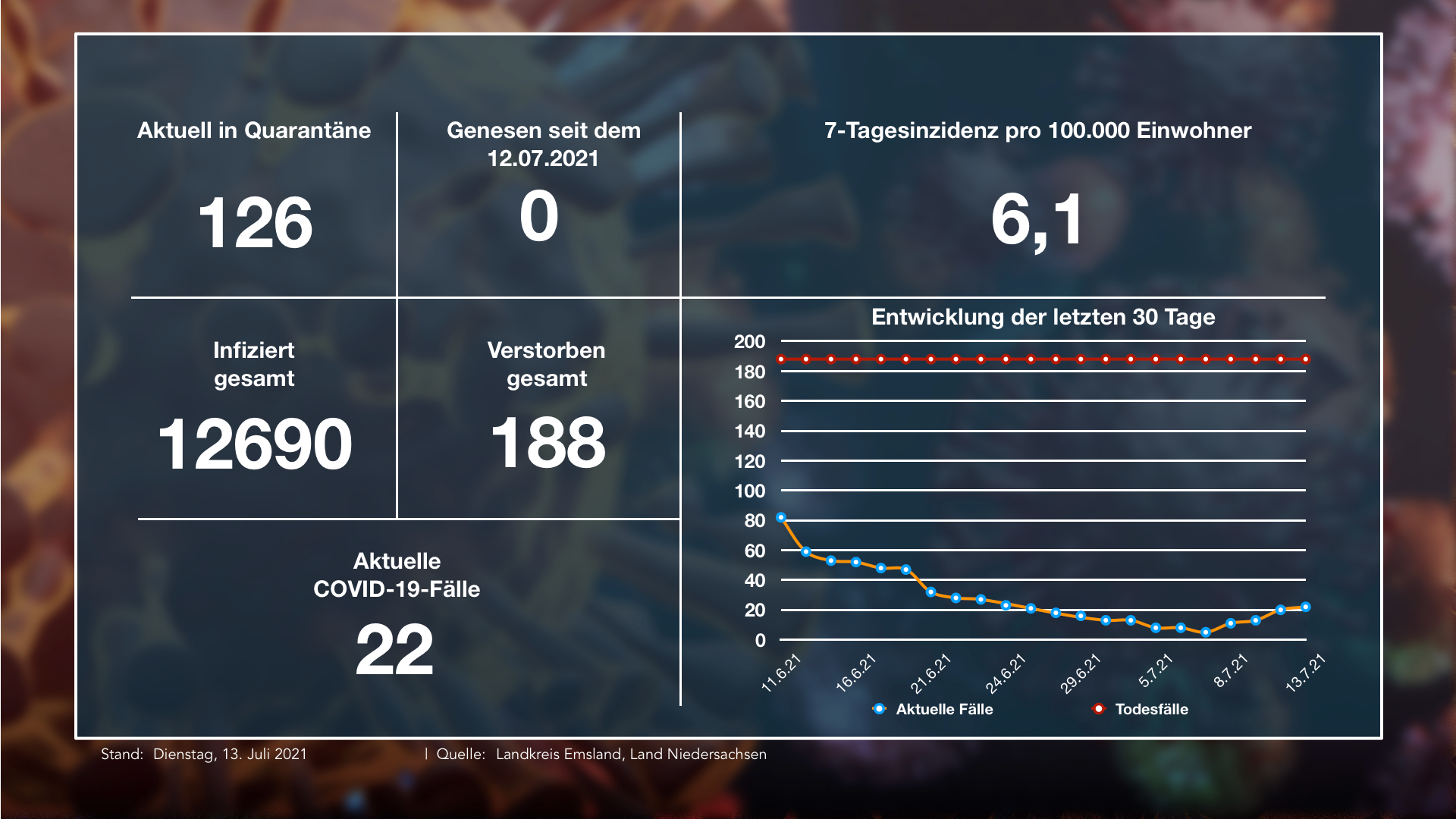 Weiterhin verstarben seit Beginn der Pandemie 188 Emsländerinnen und Emsländer im Zusammenhang mit dem Virus. Momentan befinden sich 126 Personen in Quarantäne.