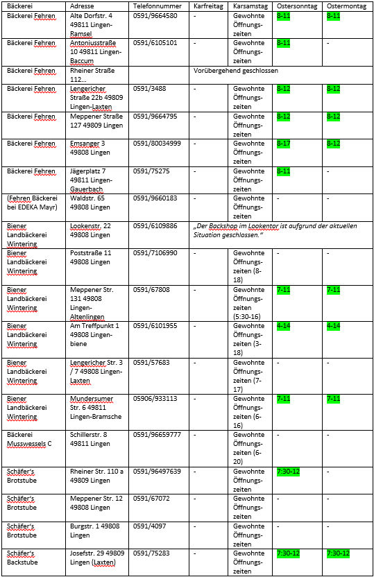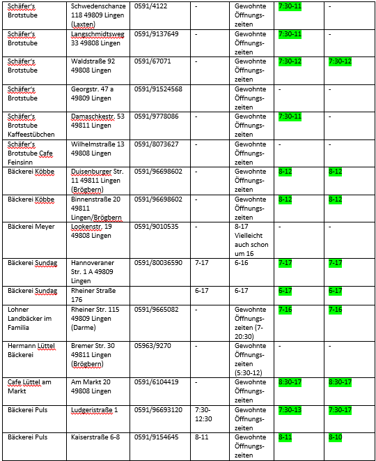 Hier eine Übersicht über die Öffnungszeiten der Bäckereien in Lingen:
