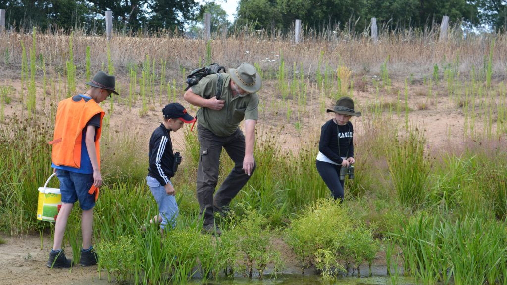 Für die zweite Gruppe ging es zur selben Zeit los mit einem Reviergang. Hierbei wurden, mithilfe von Jagdhunden, Spuren im Sand, an einer für Amphipien gebauten Wasserstelle, gesucht und den jeweiligen Tieren zugeordnet, eine Magerrasenfläche besichtigt, auf der deutliche Spuren von Füchsen auf der Suche nach Nahrung erkennbar waren und der Hochsitz erklommen. Zum Abschluss dieser ereignis- und lehrreichen Veranstaltung gab es für die Schülerinnen und Schüler noch kalte Getränke und Bratwürstchen vom Grill.