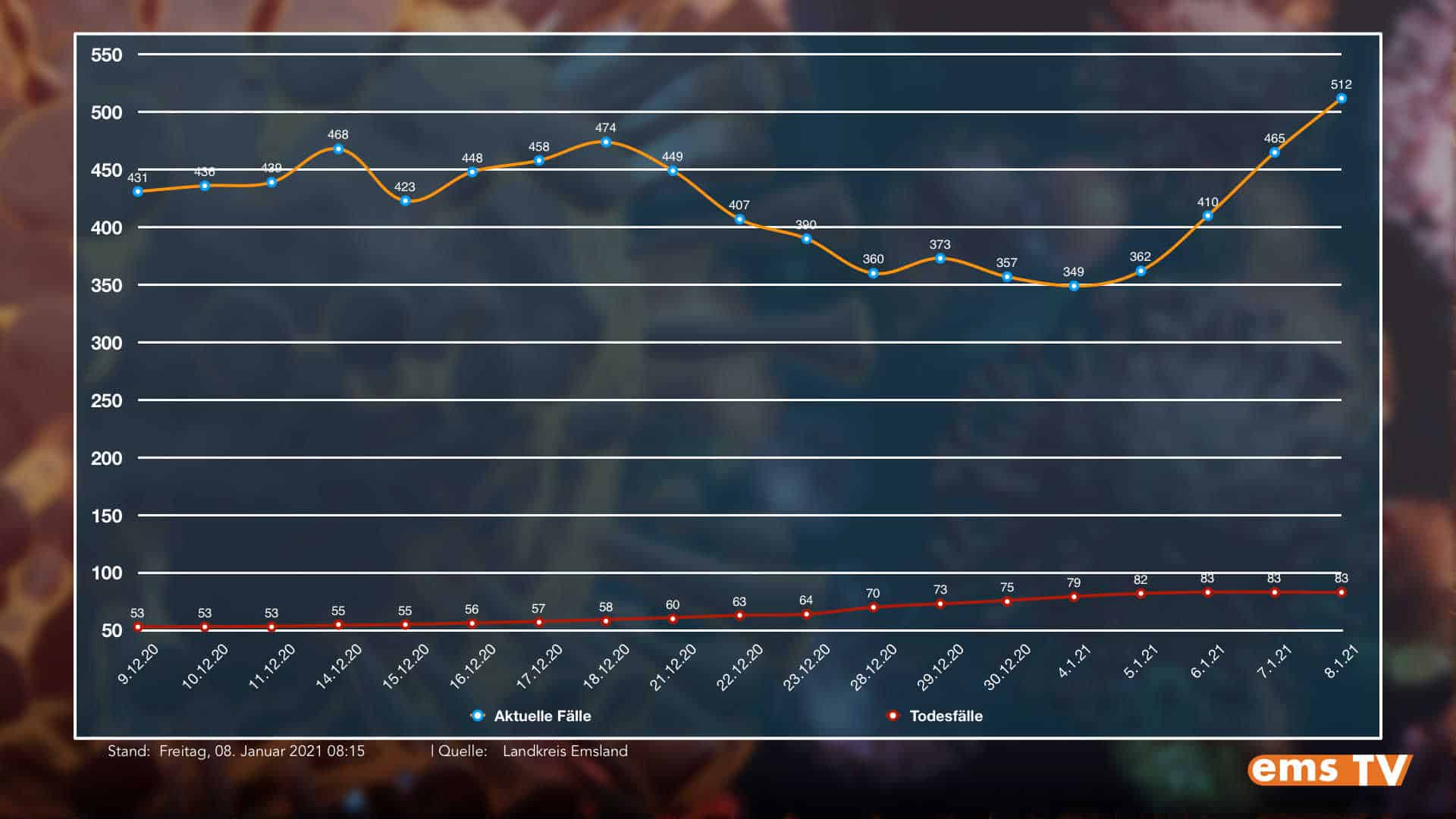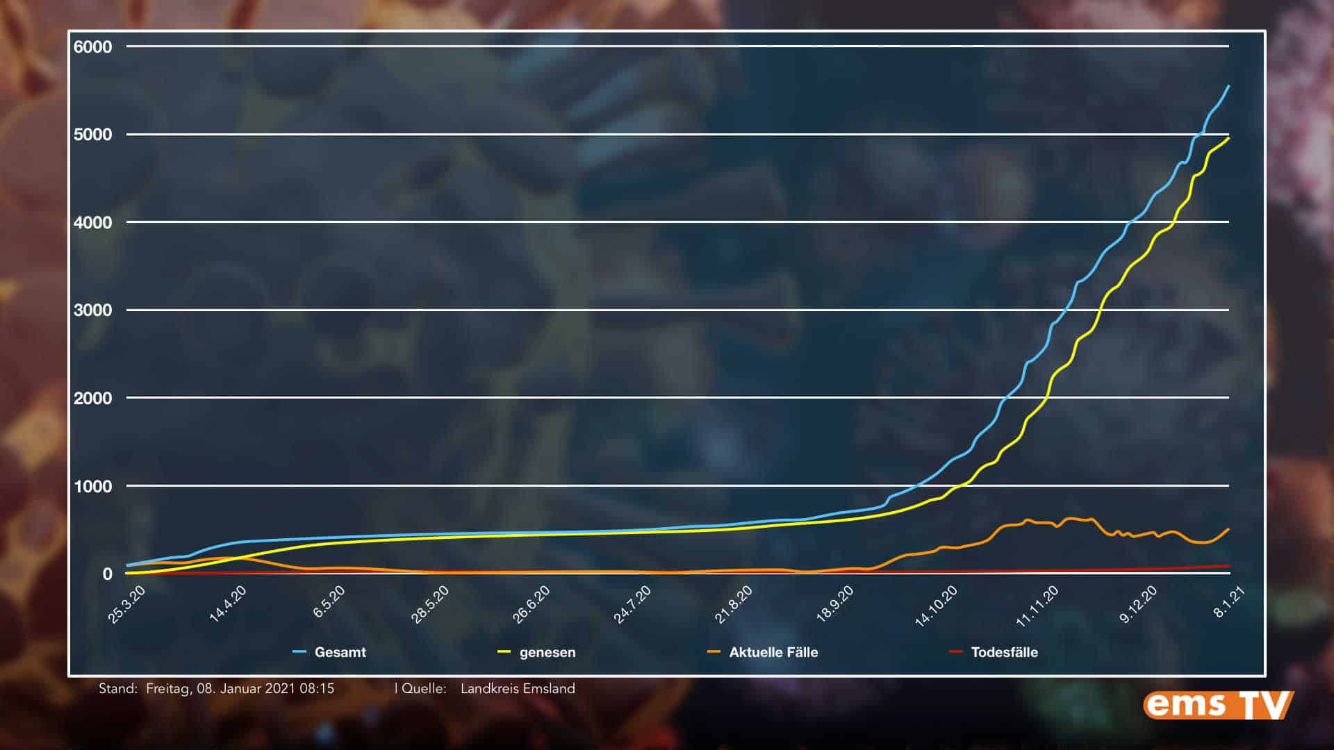 Landkreis Emsland: Das Gesundheitsamt meldet mittlerweile insgesamt 5558 Corona-Fälle. Dies sind 112 mehr als am gestrigen Donnerstag. Die Zahl genesener Personen stieg um 65 und liegt damit bei 4963. Als aktuell infiziert gelten heute 512 Emsländerinnen und Emsländer – 47 mehr als gestern. Wieder ist in Papenburg ein stärkerer Anstieg der Fälle zu registrieren, als in den anderen emsländischen Städte und Kommunen. Seit gestern stiegen hier die Fälle um 22 auf 133 aktuelle Infektionen.