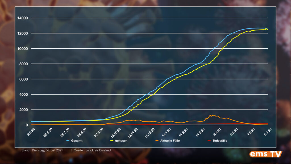Landkreis Emsland: Das Gesundheitsamt meldet seit gestern keine weiteren Neuinfektionen mit dem Coronavirus. Seit Beginn der Pandemie galten bislang insgesamt 12.674 Menschen als infiziert. Die Zahl der Genesenen bleibt ebenfalls unverändert bei insgesamt 12.478. Aktuell gelten acht Personen als infiziert. Der Wert der 7-Tage-Inzidenz bleibt unverändert bei 1,2.